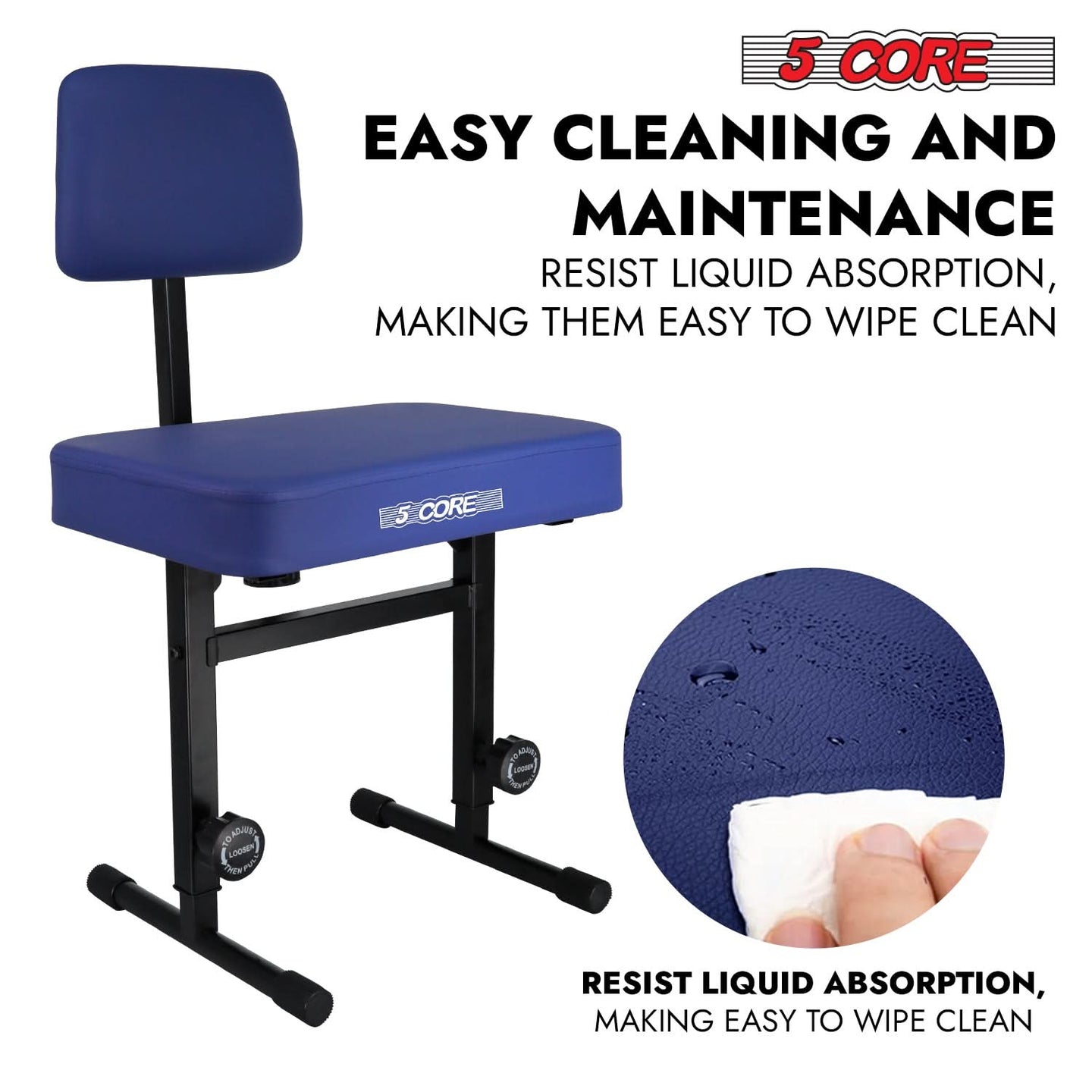 | Easy to wipe clean and protect the seat from accidental spills or stains, ensuring the foldable Keyboard bench stays looking like new for years. | The musician chair frame is coated with a scratch-resistant finish, maintain its sleek appearance even with regular use and movement. | Setup without any special tools. Attach the legs, bracket, crossbeam & backrest, next insert the base and set the height to your liking. | Designed for more than just keyboard, this adjustable piano bench is perfect for use with pianos, Casio, and other instruments. Can be used for practice, performances, teaching, or even casual seating. |