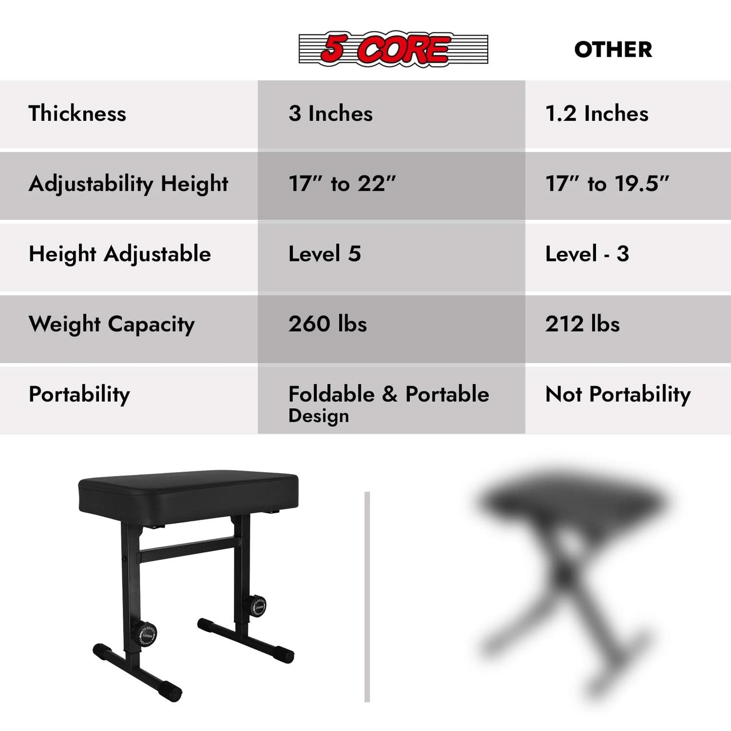 | 5 Core professional keyboard bench offers exceptional support with a 260 lb weight capacity, perfect for adults and kids. The padded 3 inch thick breathable sponge seat ensures comfort during long playing sessions, while the adjustable height (17 inches to 22 inches) and 5 position gear system allow for easy customization. Built with durable materials like metal alloy, leather, and wood, this keyboard piano seat is designed to last. Its compact design makes it easy to transport and store. A beginner friendly and reliable choice for both home, studio and stage setups, combining functionality with comfort. |