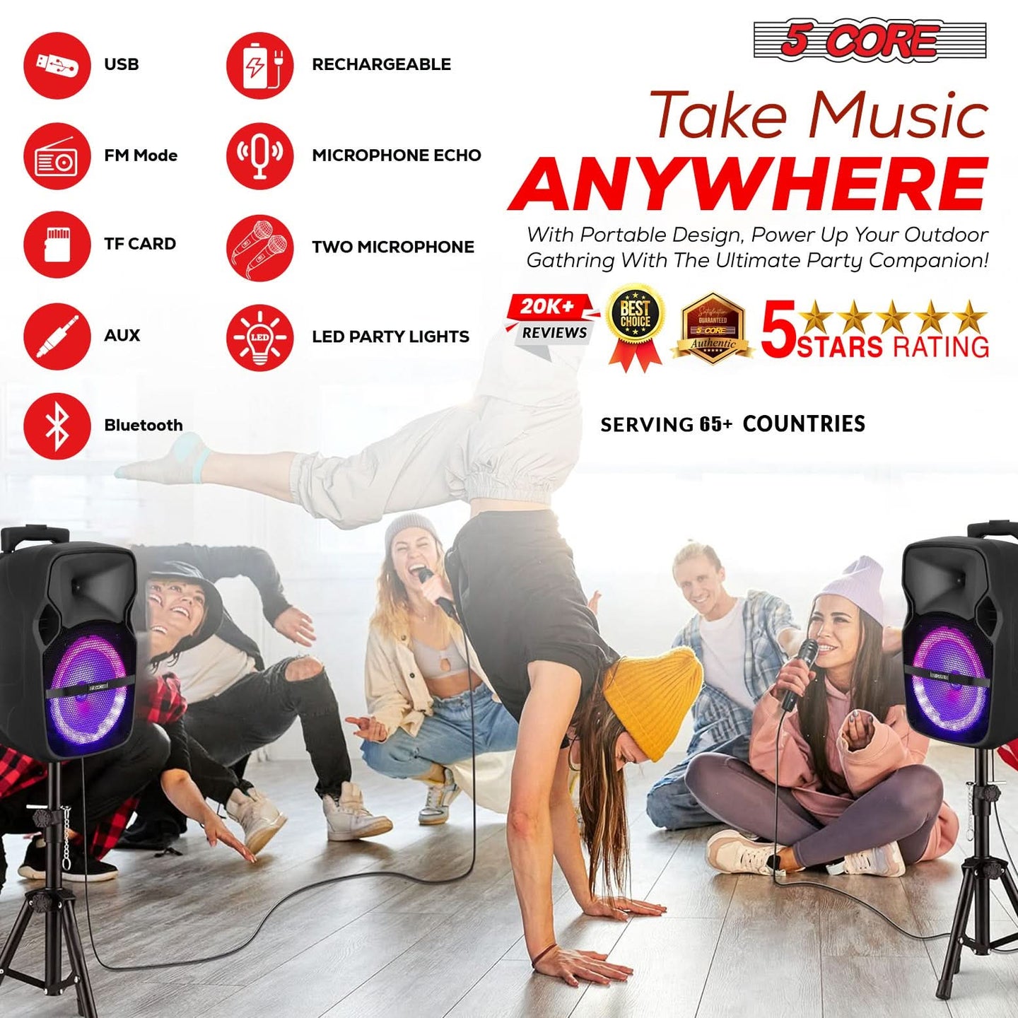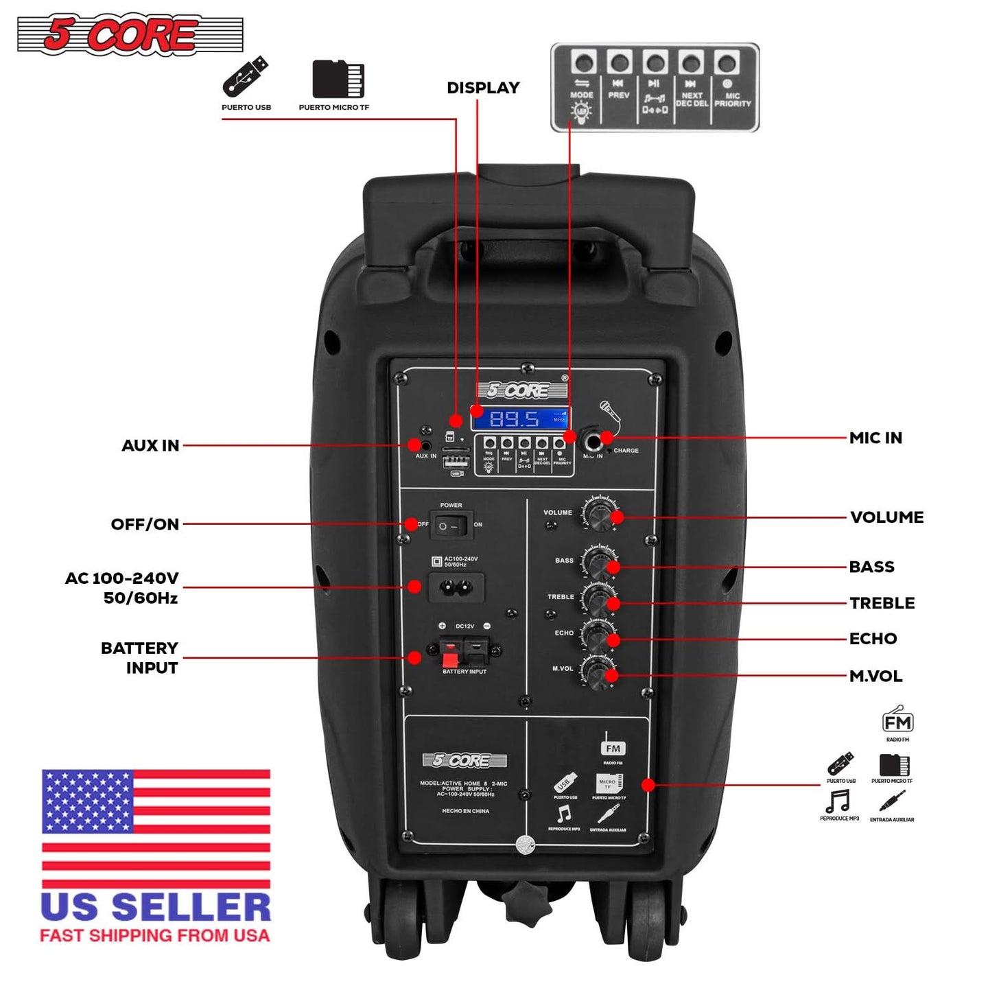 Experience powerful sound with the 5 Core DJ PA party speaker, featuring a 8 inch speaker and a frequency range of 80hz -16khz. Delivering an impressive 250W power, a robust 16 Oz magnet, it ensures deep bass and clear highs. The super bullet tweeter enhances audio clarity. Designed for convenience, it includes a retractable handle, wheels, which make it easy to carry. This is a rechargeable DJ speaker with a subwoofer; you do not need an outlet to enjoy high quality music. One single charge on this will run for 3 to 5 hours. The remote control offers easy operation. The Bluetooth speaker system brings professional music to home, outdoors, or karaoke. |