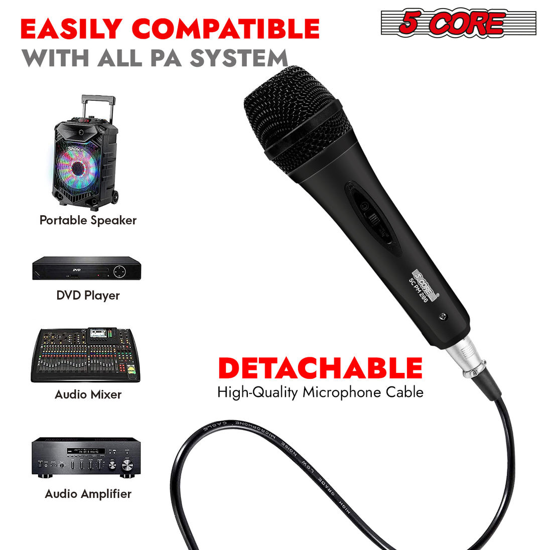 Experience superior audio quality with the 5 Core vocal handheld dynamic karaoke microphone, designed to deliver brilliant sound reproduction while reducing noise and feedback. The wide frequency response in the dynamic microfono ensures consistent sound pickup from the source and keeps its natural form. You don't need to do a lot of equalization to get the perfect sound. This is a professional vocal microphone for singing, designed to offer you clarity and amazing sound. A standard wired XLR to 1/4 inch plug connection lets you enjoy reliable performance. There is no latency or radio wave interference. This rugged plastic microphone is made from fresh ABS material with a reinforced steel windscreen to safeguard internal components. Even if you drop the anti-dent ring, keep this microfono safe. Ideal vocal microphone for singing, karaoke, DJ, PA, speeches, and more. This dynamic microphone XLR is your go-to for clear, reliable, and professional performance. |