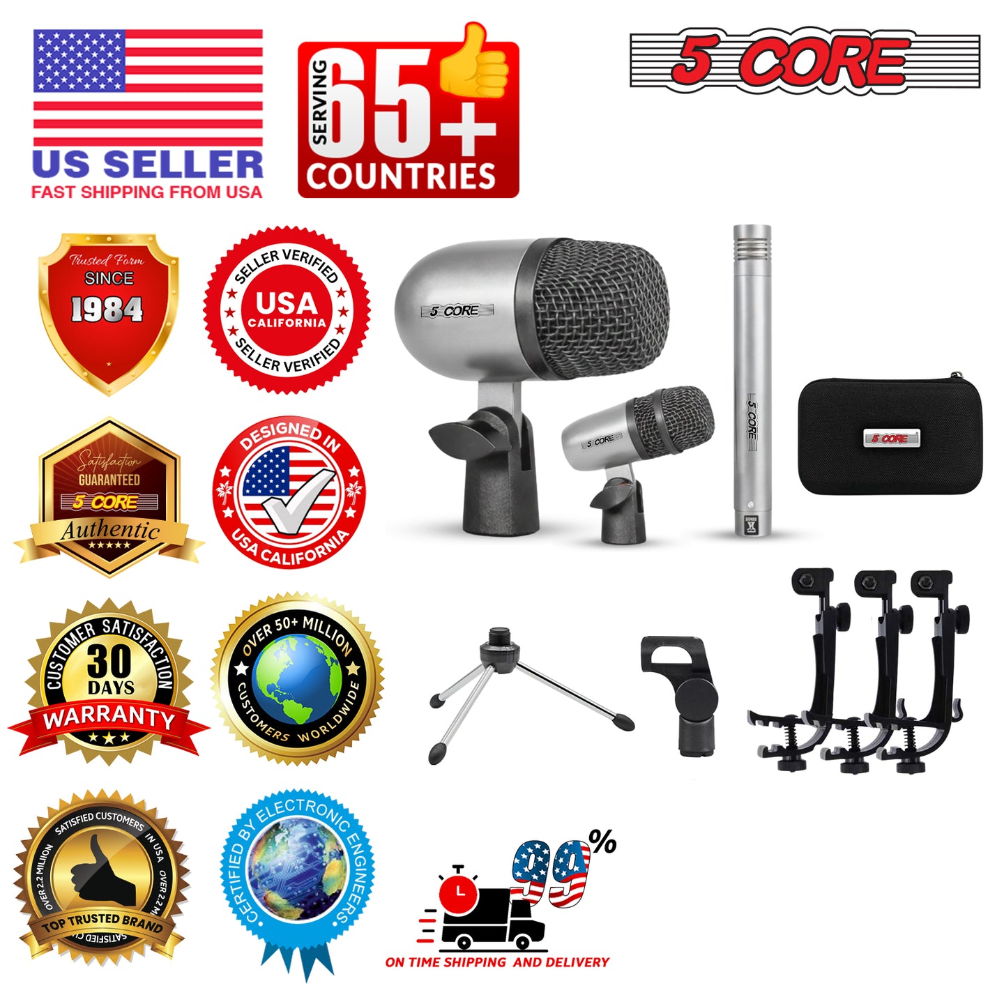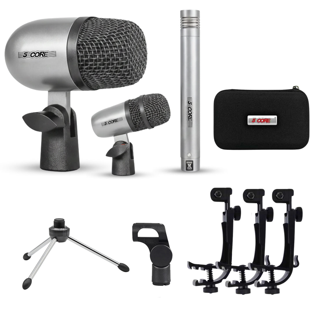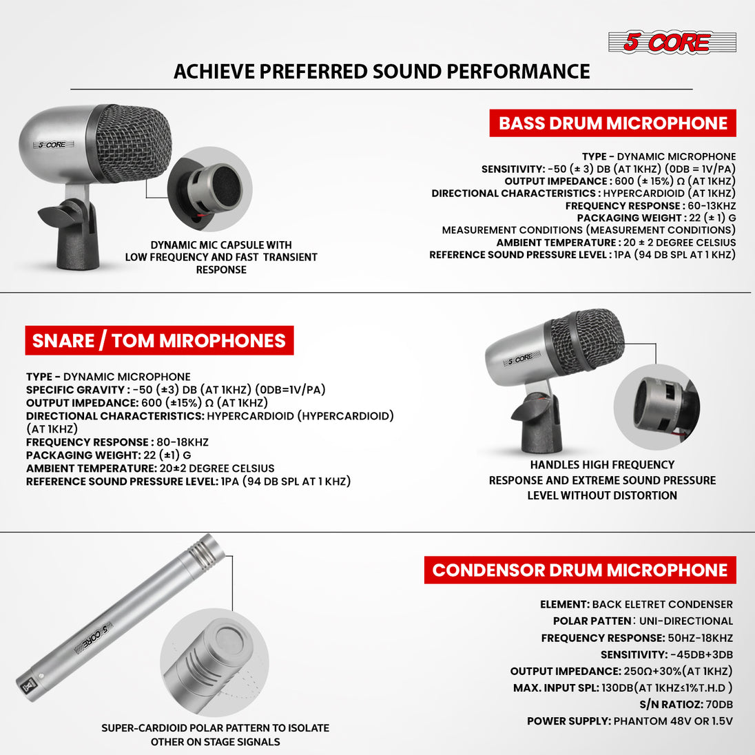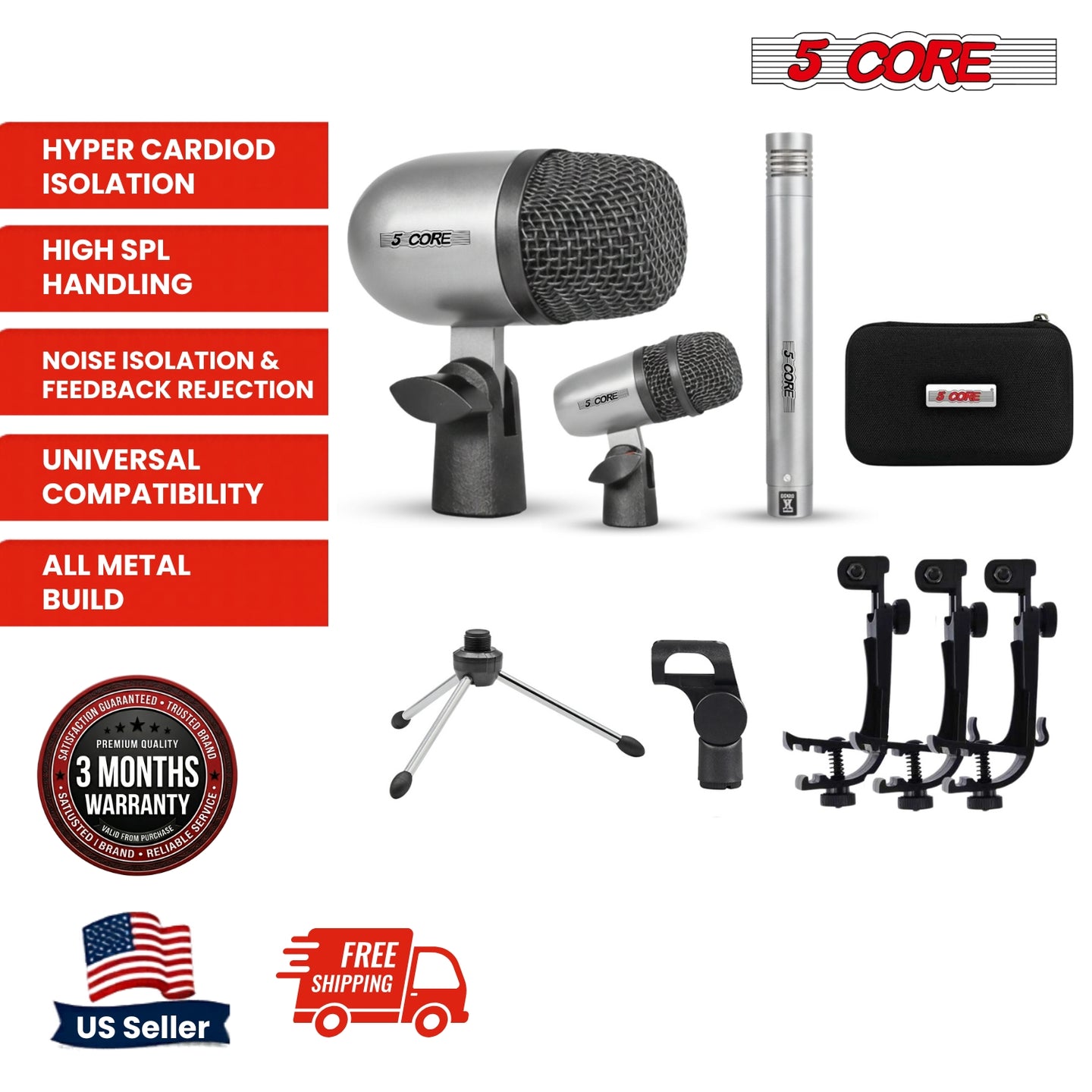 Upgrade your sound with this professional drum mic kit engineered for powerful, balanced drum capture. This complete drum microphone set includes a dynamic kick drum mic (60–13kHz) for deep, punchy lows, hypercardioid snare and tom drum mics (80–18kHz) for tight isolation, and back electret condenser overheads (50Hz–18kHz) for crisp cymbal detail.