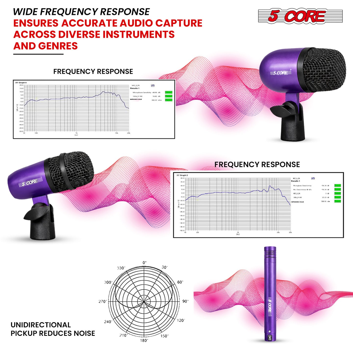 With optimized sensitivity (-50dB dynamic / -45dB condenser) and stable impedance ratings, this drum mic kit delivers consistent output levels across your entire drum kits. That means less gain boosting, reduced hiss, and smoother EQ adjustments during live mixing or studio recording.
