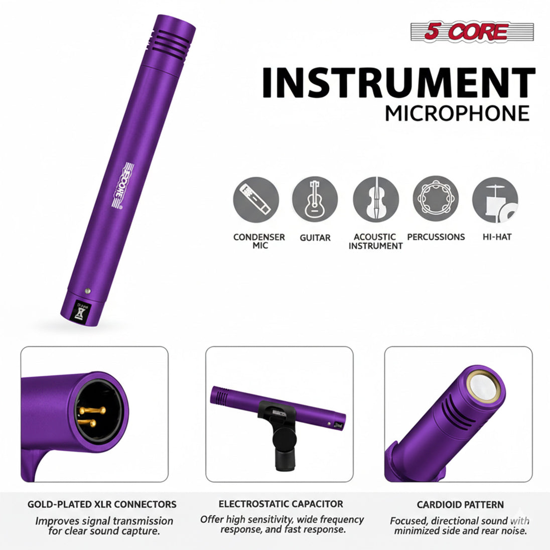 Upgrade your sound with this professional drum mic kit engineered for powerful, balanced drum capture. This complete drum microphone set includes a dynamic kick drum mic (60–13kHz) for deep, punchy lows, hypercardioid snare and tom drum mics (80–18kHz) for tight isolation, and back electret condenser overheads (50Hz–18kHz) for crisp cymbal detail.