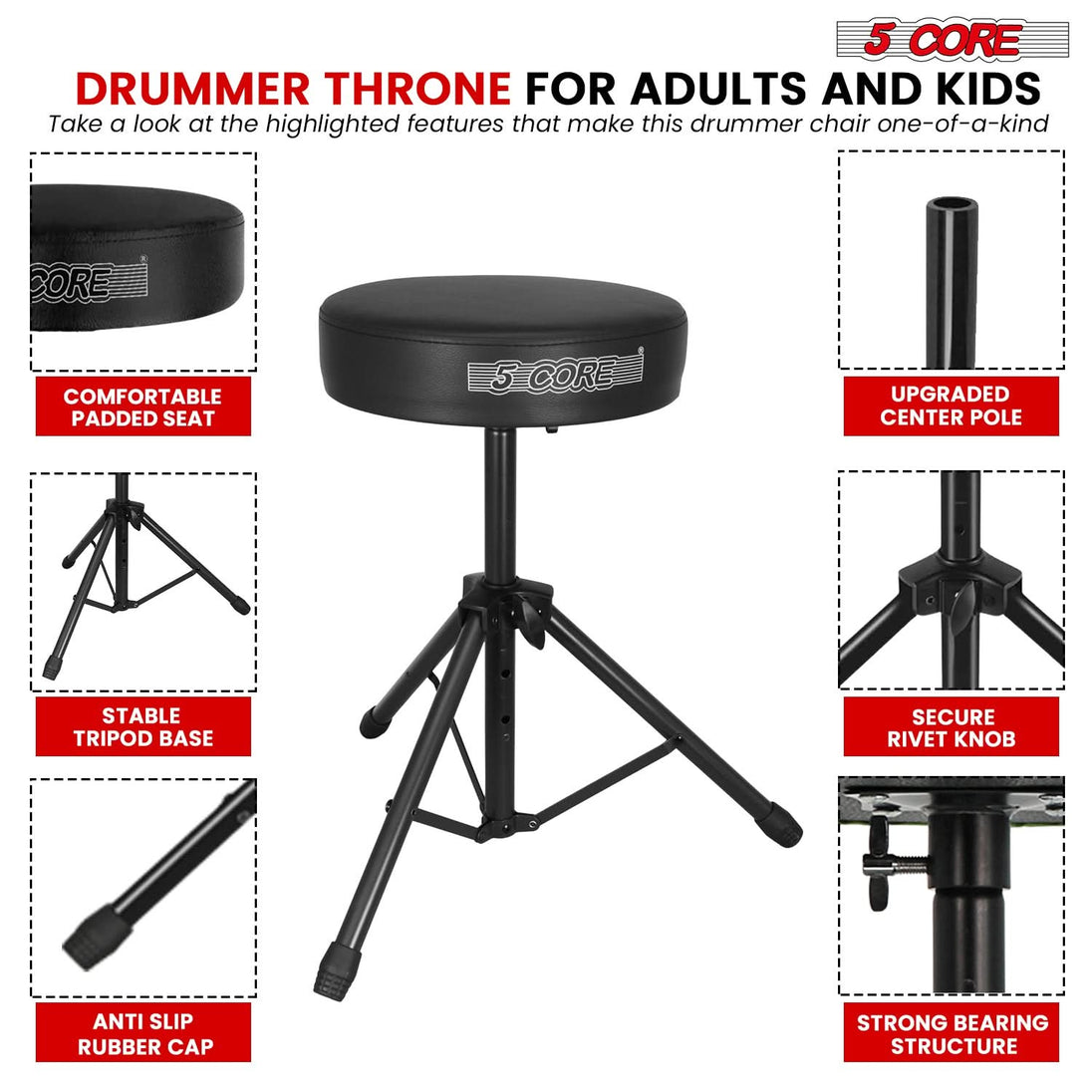 Experience unmatched performance with the 5 Core drum throne. Its 3 inch thick, 12 inch wide padded seat provides lasting comfort for long drumming sessions. This adjustable drum throne seat ranges from 20.5 to 22 inch, ensuring perfect playing position. The professional drum throne supports up to 330 lbs, making it ideal for both adults and kids. The anti-slip rubber-capped tripod legs offer superior stability on any surface. Versatile in use, this drummer chair can be used as a music stool, DJ seat, guitar stool, and more. Easy to install and portable, it features a collapsible design. Enjoy reliable performance with sturdy metal safety pin and a high-density sponge cushion, making it the perfect drummer throne for any setting.