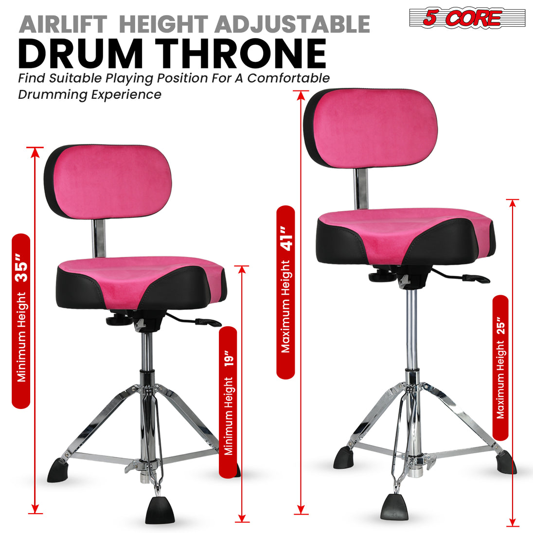 Upgrade your drumming experience with the 5 Core Air-Adjustable Velvet Saddle Drum Throne. Featuring a 4-inch high-density foam cushion with a soft velvet cover, this ergonomic saddle seat ensures maximum comfort for long practice or performance sessions. The air-lift height adjustment (19"–25") allows precise, effortless customization, while the double-braced steel legs and non-slip rubber feet provide rock-solid stability, supporting up to 441 lbs. Ideal for drummers, guitarists, and keyboardists, its sleek design and premium finish add style to any setup. Lightweight, durable, and versatile, this drum throne delivers unmatched comfort, stability, and professional appeal for musicians of all levels. |