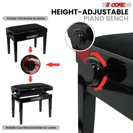 5 Core Adjustable Piano Bench Thick 3.25" Solid Wood Keyboard Stool Heavy Duty Musician Chair