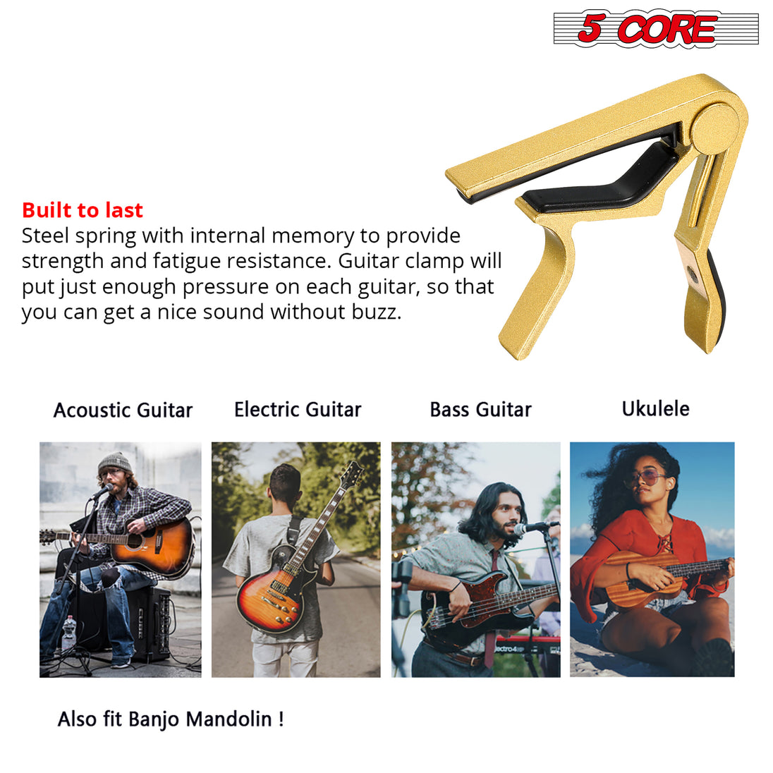 【Fits Multiple Instruments】 More than just a capo for acoustic guitar, this versatile guitar clamp works with electric guitars, ukuleles, banjos, bass, and mandolins. A must-have guitar accessory for any player.