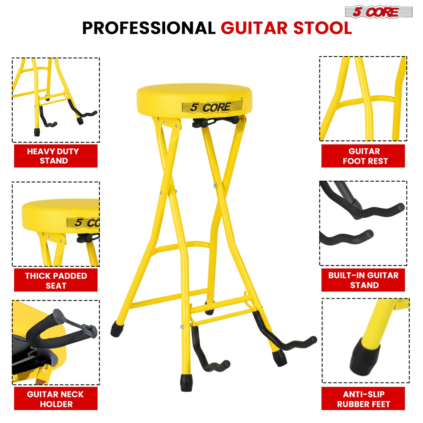 This guitar stool is built with a strong iron frame and a thick 3.15 inch padded seat for steady comfort during long playing sessions. The 29 inch height, 12 inch seat size, and built-in foot rest give you a balanced and natural playing position. A secure guitar neck rest holds acoustic, electric, or bass guitars when you take a break, making it a practical 2-in-1 guitar chair and stand. Non slip caps keep the stool stable on different floors, and the folding design makes storage simple. Ideal for guitarists who want a dependable guitar seat for home, studio, or stage use.