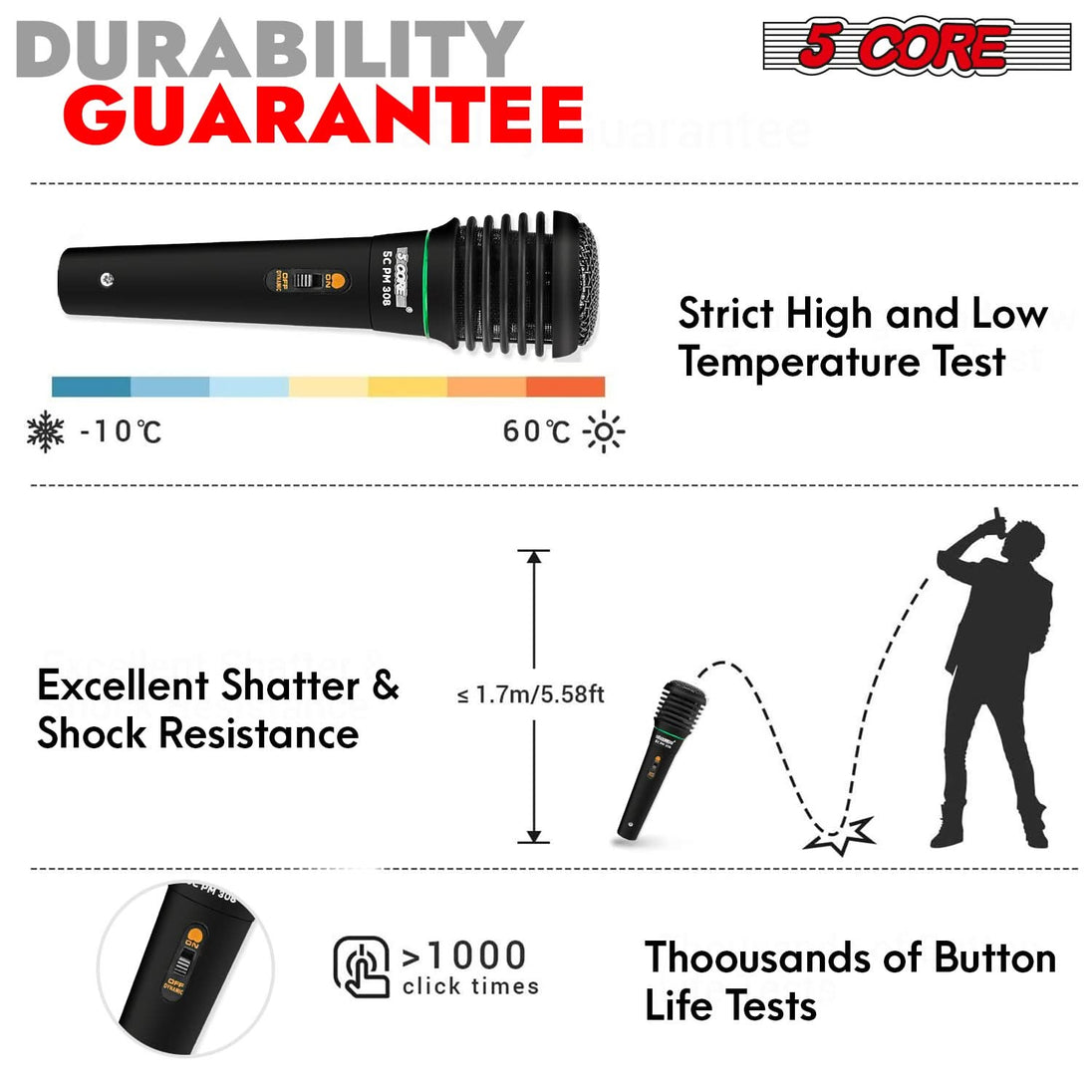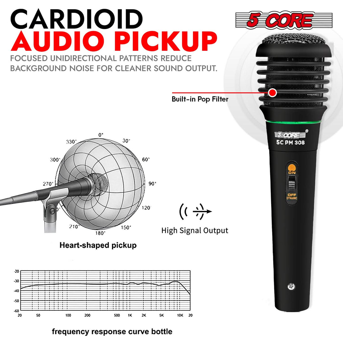 Experience superior audio quality with the 5 Core cardioid karaoke microphone, designed to deliver brilliant sound reproduction while reducing noise and feedback. The wide frequency response in the dynamic microfono ensures consistent sound pickup from the source and keeps its natural form. You don't need to do a lot of equalization to get the perfect sound. This is a professional vocal microphone for singing, designed to offer you clarity and amazing sound. A standard wired XLR to 1/4 inch plug connection lets you enjoy reliable performance. There is no latency or radio wave interference. This rugged plastic microphone is made from fresh ABS material with a reinforced steel windscreen to safeguard internal components. Even if you drop the anti-dent ring, keep this microfono safe. Ideal vocal microphone for singing, karaoke, DJ, PA, speeches, and more. This dynamic microphone XLR is your go-to for clear, reliable, and professional performance. |