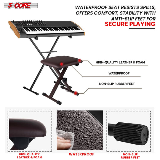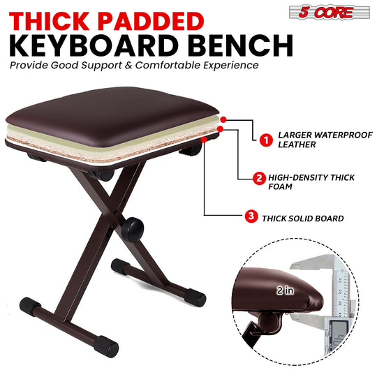 X-Style Adjustable Benches: Portable Powerhouse with a Trade-Off These foldable, scissor-style designs shine for on-the-go use—ultra-light and compact, making them a no-brainer for digital keyboard setups or musicians hauling gear to gigs. Height adjusts quickly via a simple lever or knob, covering the full range most adults need (17–22 inches). In tests, they handle light-to-moderate dynamics without issue, but under heavy fortissimo passages or if you're over 200 lbs, you'll notice a subtle flex in the frame—nothing catastrophic, but enough to disrupt ultra-precise control in fast runs. Longevity is solid for 5–10 years with casual use, but the metal joints can loosen over time if you're folding/unfolding frequently.