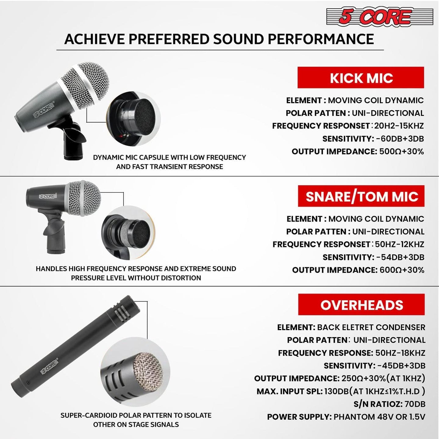 Each drum microphone is tuned to capture the unique sound of snare, toms, bass drums, and cymbals, providing a balanced and natural audio output for any 7 piece drum set |