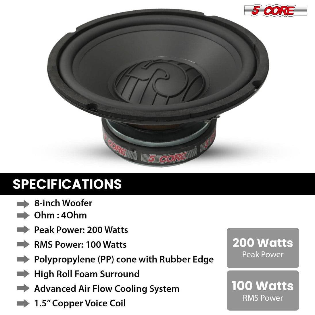 【High Power 8 Inch Woofer 】Delivers 100W RMS / 200W Peak for deep, punchy bass. Perfect upgrade for car speakers or custom car subwoofers setup.