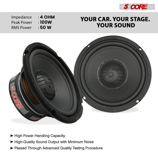 5 Core 6.5 Inch Woofer Pair 100W Car Subwoofer 4Ohm Replacement Deep Sub w Poly Cone