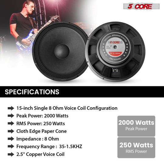 5 Core 15" Guitar Speaker 2Pc Replacement 2000W 8 Ohm Low Distortion for Electric Guitar Amp Cabinet