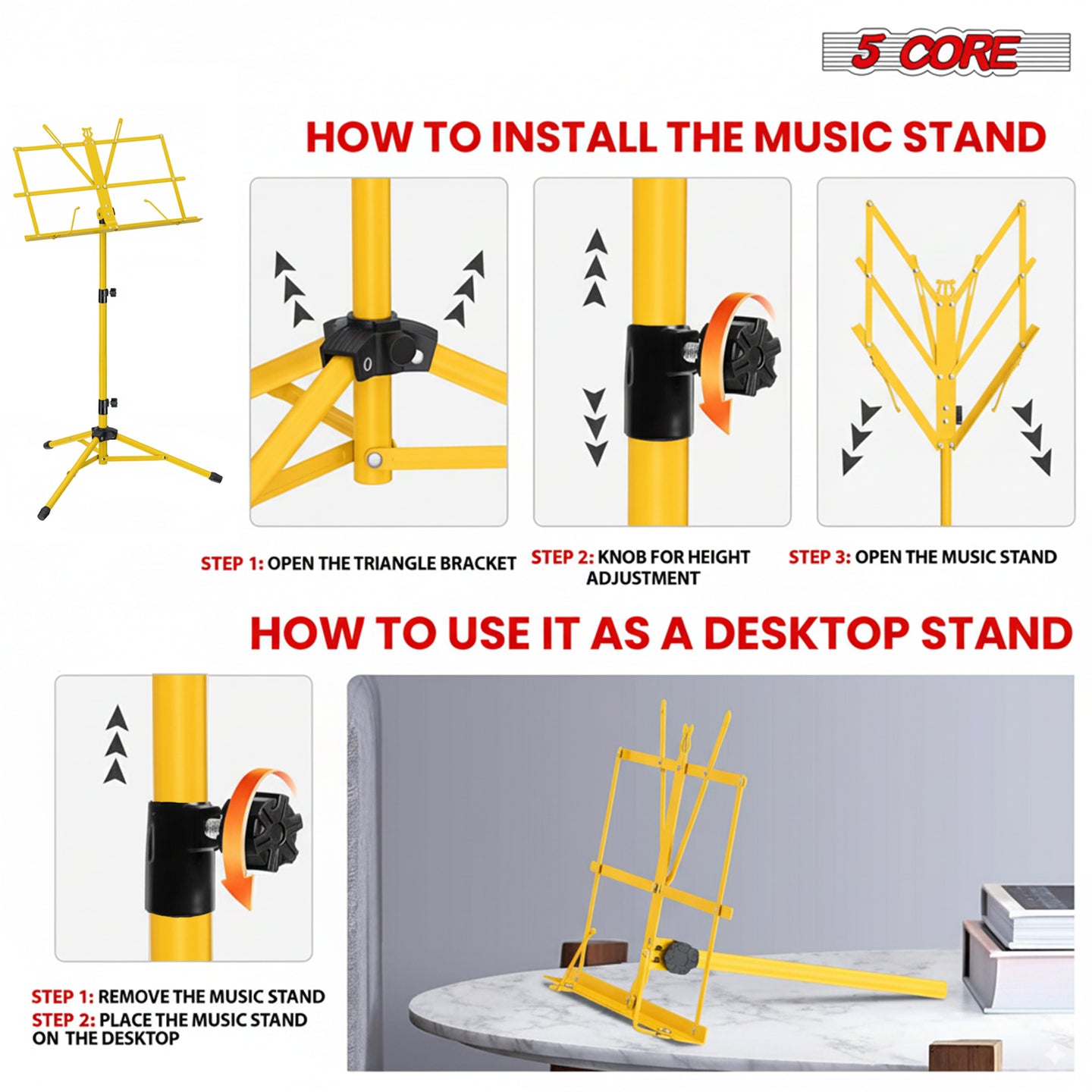 The guitar music stand allows for precise height adjustments, accommodating a variety of playing positions and ensuring optimal comfort. | The sheet music stand has a max load capacity of 8 lbs, providing strong support for even the heaviest music books and accessories. | Non-slip rubber pads on each leg, offers enhanced stability and prevents slipping also protect the floor from scratches and damages. | With a user-friendly design, our collapsible music stand is quick to set up and adjust, requiring no tools or excessive effort. |