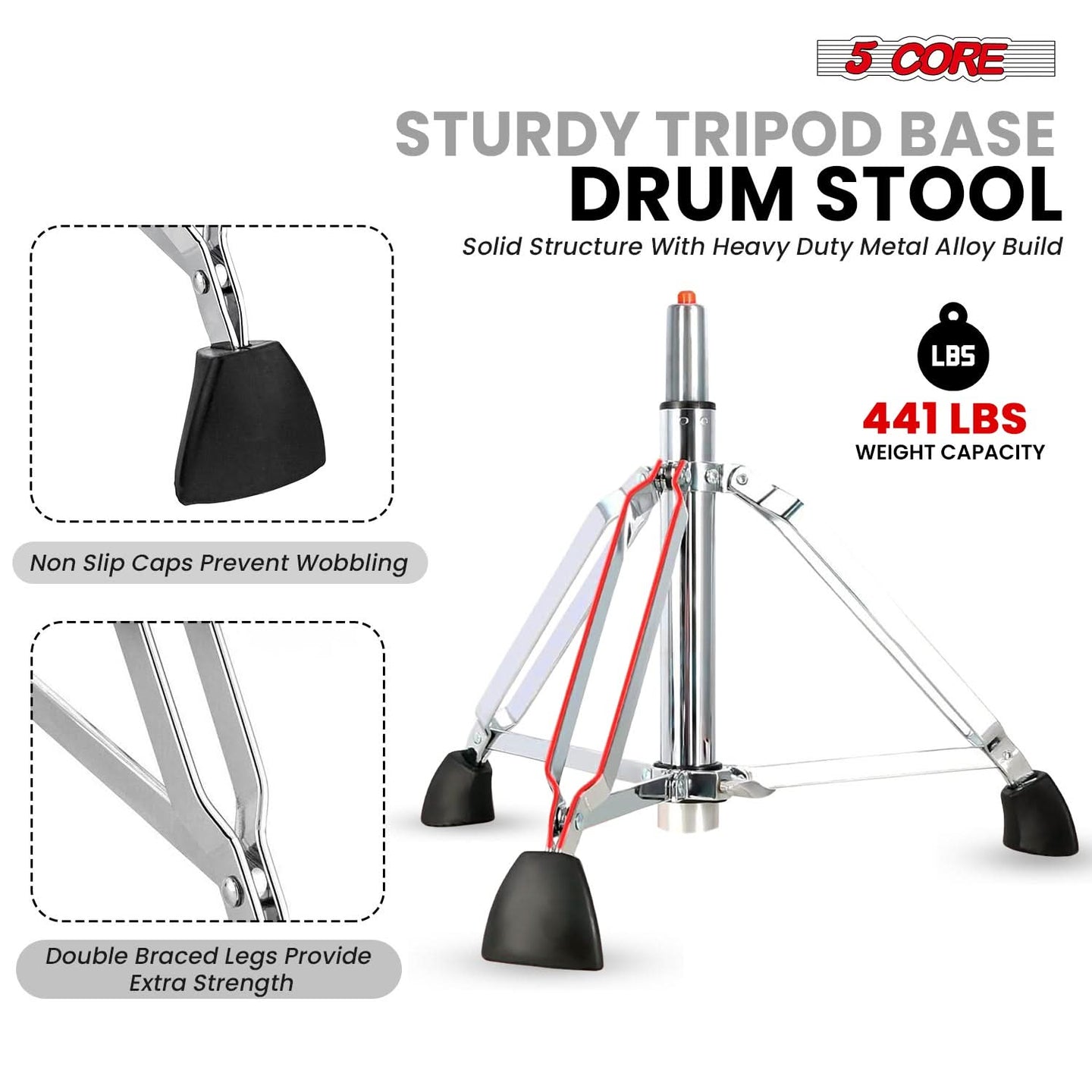 Upgrade your drumming experience with the 5 Core Air-Adjustable Velvet Saddle Drum Throne. Featuring a 4-inch high-density foam cushion with a soft velvet cover, this ergonomic saddle seat ensures maximum comfort for long practice or performance sessions. The air-lift height adjustment (19"–25") allows precise, effortless customization, while the double-braced steel legs and non-slip rubber feet provide rock-solid stability, supporting up to 441 lbs. Ideal for drummers, guitarists, and keyboardists, its sleek design and premium finish add style to any setup. Lightweight, durable, and versatile, this throne delivers unmatched comfort, stability, and professional appeal for musicians of all levels. |