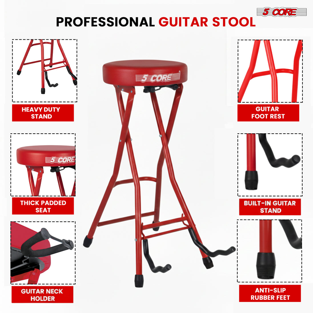 This guitar stool is built with a strong iron frame and a thick 3.15 inch padded seat for steady comfort during long playing sessions. The 29 inch height, 12 inch seat size, and built-in foot rest give you a balanced and natural playing position. A secure guitar neck rest holds acoustic, electric, or bass guitars when you take a break, making it a practical 2-in-1 guitar chair and stand. Non slip caps keep the stool stable on different floors, and the folding design makes storage simple. Ideal for guitarists who want a dependable guitar seat for home, studio, or stage use. |