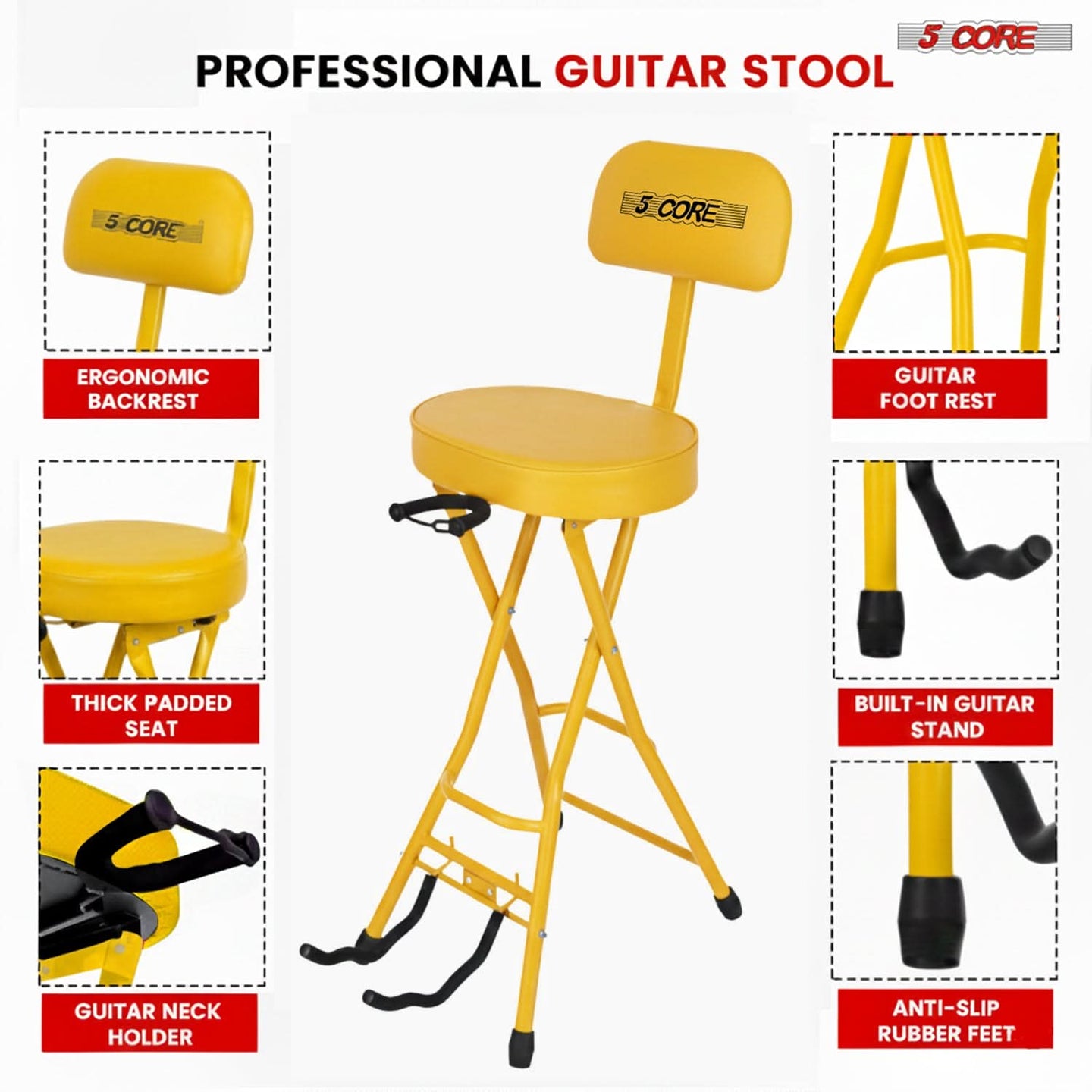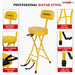 This guitar stool is built with a strong iron frame and a thick 3.15-inch padded seat, now enhanced with a supportive backrest to keep you comfortable and properly aligned during long playing sessions. The 29-inch height, 12-inch seat size, and built-in footrest create a balanced, natural playing posture, while the backrest reduces fatigue and helps maintain consistent technique. A secure guitar neck rest holds acoustic, electric, or bass guitars when you take a break, giving you a practical 2-in-1 guitar chair and stand. Non-slip caps keep the stool stable on different floors, and the folding design makes storage simple. Ideal for guitarists who want dependable comfort for home, studio, or stage use. |