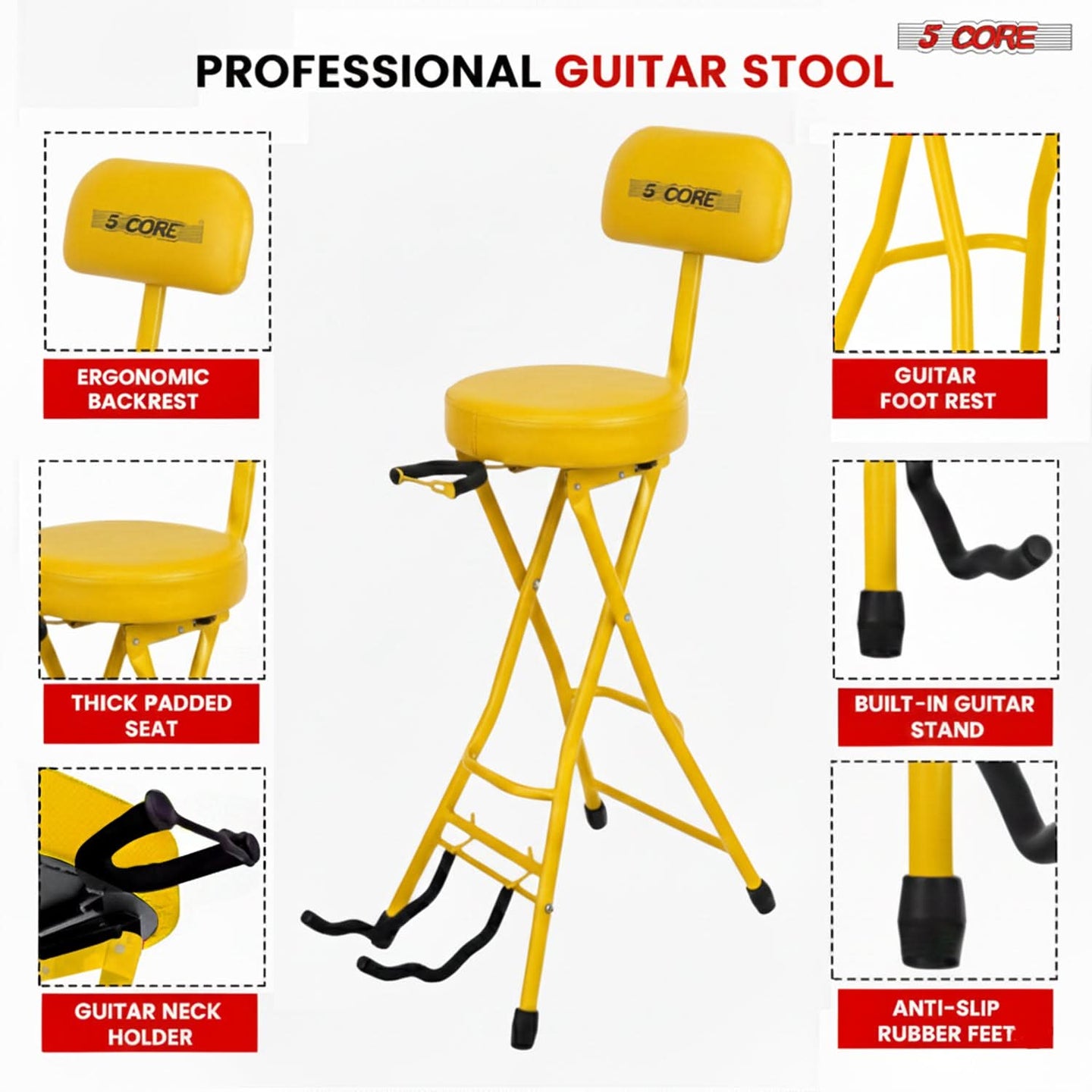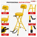 This guitar stool is built with a strong iron frame and a thick 3.15-inch padded seat, now enhanced with a supportive backrest to keep you comfortable and properly aligned during long playing sessions. The 29-inch height, 12-inch seat size, and built-in footrest create a balanced, natural playing posture, while the backrest reduces fatigue and helps maintain consistent technique. A secure guitar neck rest holds acoustic, electric, or bass guitars when you take a break, giving you a practical 2-in-1 guitar chair and stand. Non-slip caps keep the stool stable on different floors, and the folding design makes storage simple. Ideal for guitarists who want dependable comfort for home, studio, or stage use. |