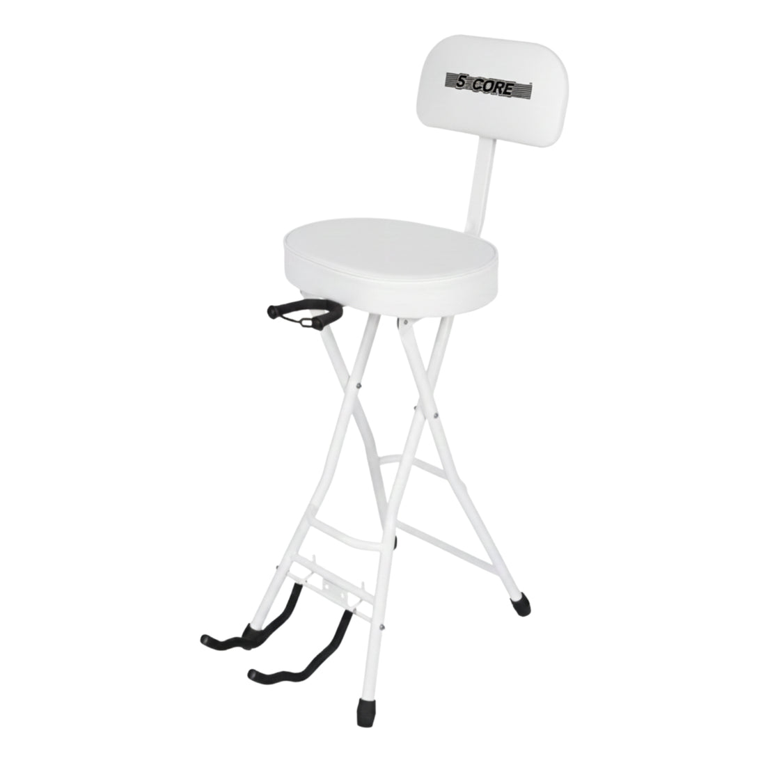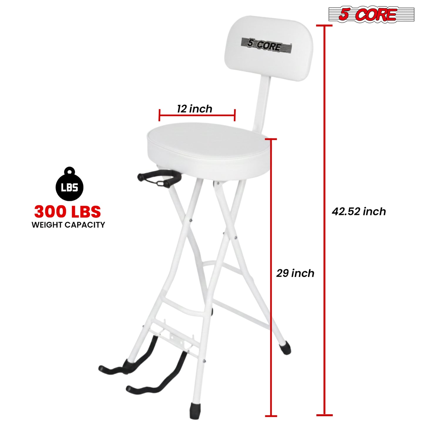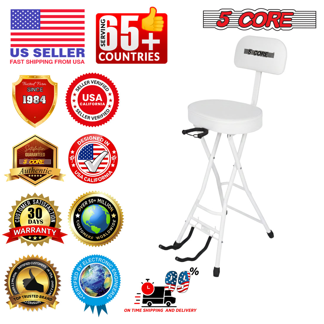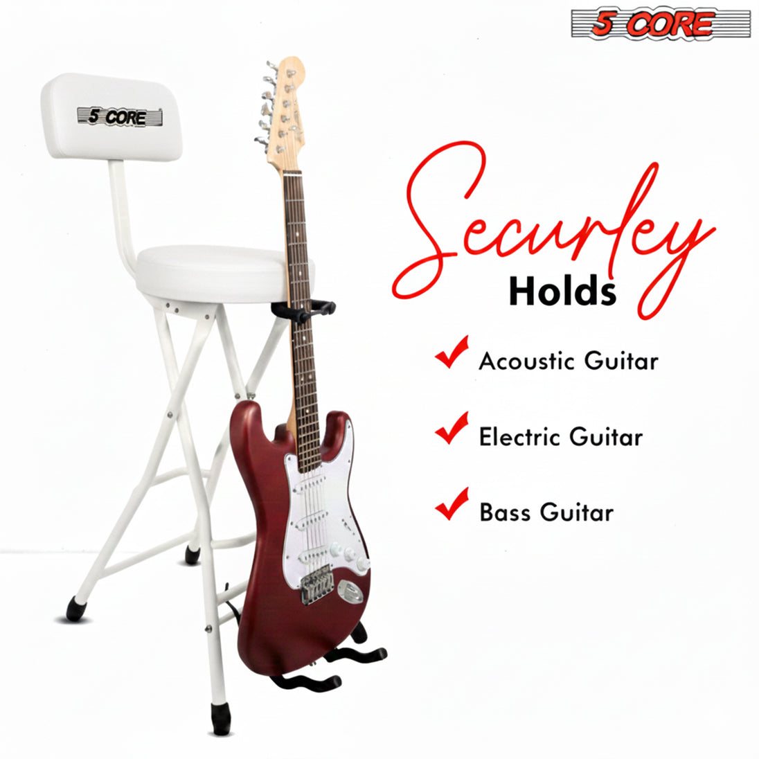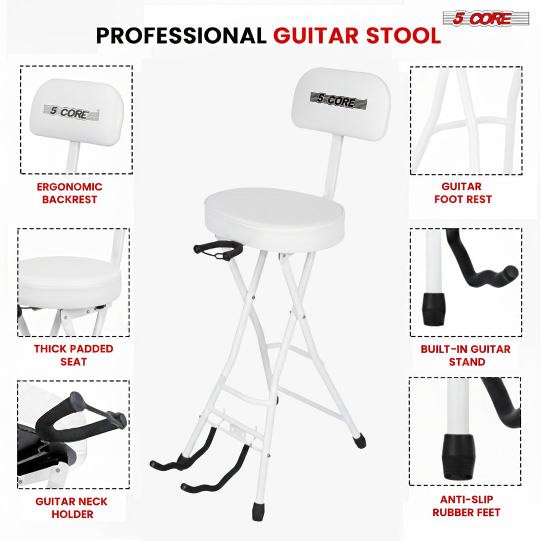 This guitar stool is built with a strong iron frame and a thick 3.15-inch padded seat, now enhanced with a supportive backrest to keep you comfortable and properly aligned during long playing sessions. The 29-inch height, 12-inch seat size, and built-in footrest create a balanced, natural playing posture, while the backrest reduces fatigue and helps maintain consistent technique. A secure guitar neck rest holds acoustic, electric, or bass guitars when you take a break, giving you a practical 2-in-1 guitar chair and stand. Non-slip caps keep the stool stable on different floors, and the folding design makes storage simple. Ideal for guitarists who want dependable comfort for home, studio, or stage use. |