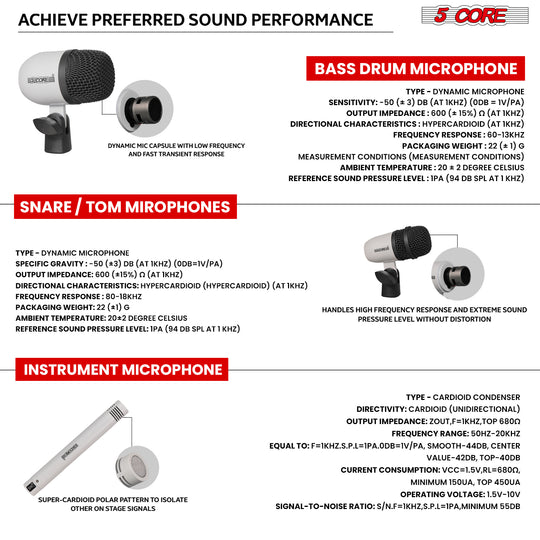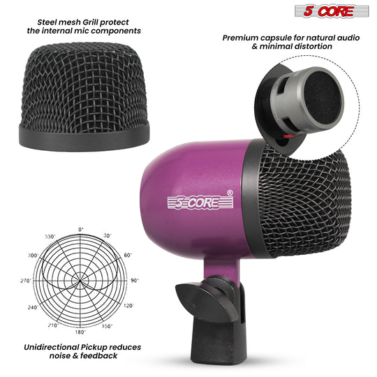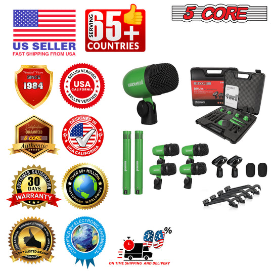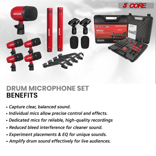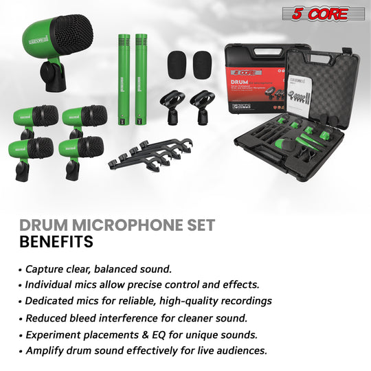 5 Core Drum Microphone Kit 7Pc All Metal Drummer Mics Tom/Snare & Cymbals Wired Instrument Drums Set