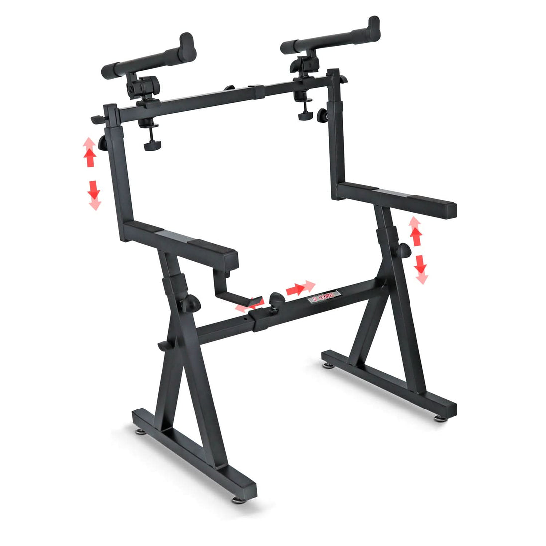 Upgrade your music experience with our professional two tier keyboard stand. Made from durable metal with reinforced joints, this keyboard riser supports up to 250 lbs, ensuring your instruments are safe. The removable second tier adjusts in 10 degree tilting increments and height from 5 to 12 inches, accommodating all your keyboard needs. Its Z frame design and rubberized, non-slip feet keep the digital piano stand stable. It is quick to assemble, and no special tools are required. Perfect for digital pianos, synths, and DJ mixers, this piano stand for 88 keyboards also features a convenient headphone holder. When not in use, it disassembles compactly for easy storage and transport. Enhance your audio setup with this reliable keyboard accessory. |