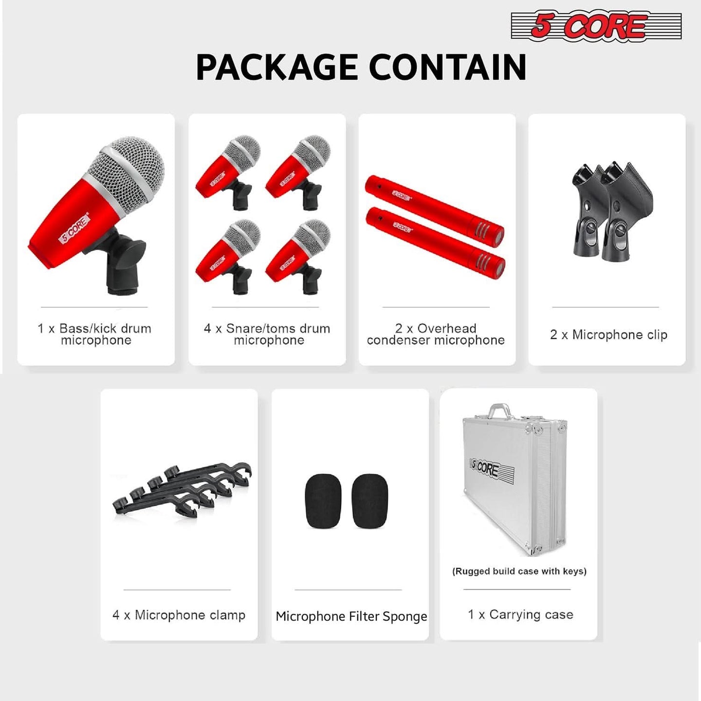 【7-Piece Drum Mic Set 】Includes 4 snare mics, 2 overhead mics, 1 kick drum mic, 2 clips, 4 clamps, 2 sponges, and a carrying case.
