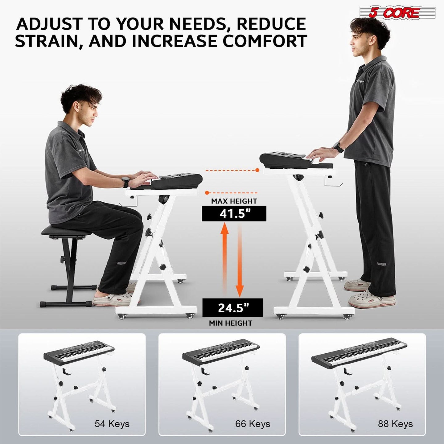 Elevate your music experience with our complete keyboard setup, featuring an adjustable stand and a matching padded keyboard/ piano stool. Enjoy the perfect playing height with customizable options. The stand adjusts from 24.5 inches to 41.5 inches in height and 21.5 inches to 36.5 inches in width, while the bench offers three levels from 14.5 inches to 20.5 inches. Made for durability, the keyboard stand's Z-style structure supports up to 330 lbs, and the X-shaped bench holds up to 340 lbs. Experience superior stability and comfort with anti-slip pads, anchor straps, and a thick 3 inch padded sponge seat. Portable and easy to use, our setup ensures seamless mobility and storage. |