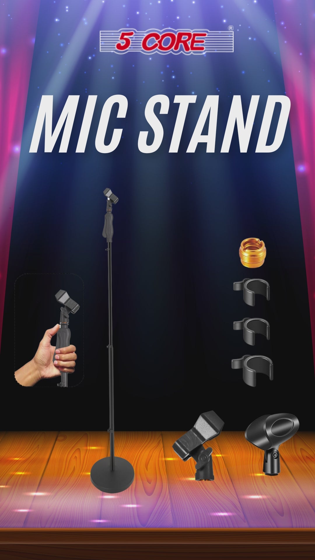 【Height Adjustable Mic Stand】 – Ranges from 35 to 57 inches with a hand clutch for easy height adjustments, fitting various performers and applications.