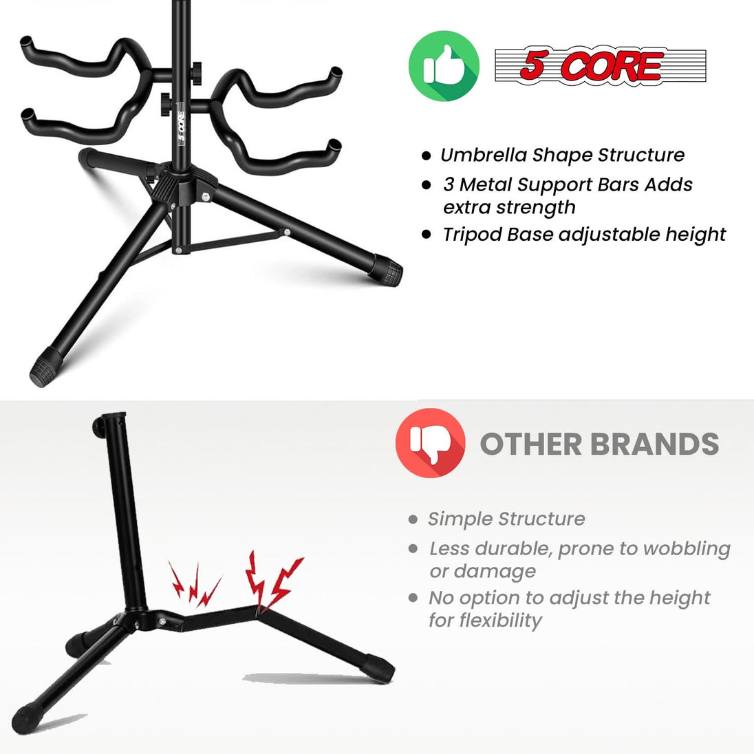 Keep your instruments safe, organized, and ready to play with the 5 Core Folding Guitar Stand. Built from durable metal with anti-corrosion paint, this universal floor guitar stand holds up to 2 guitars—perfect for electric, acoustic, bass, or even ukuleles. The adjustable height (17 to 25.5 inches) allows customized setup, while the tripod base and anti-slip feet ensure maximum stability. Soft padded contact points protect your instruments from scratches. Lightweight and foldable, it’s easy to store and carry—ideal for home, studio, or stage use. A reliable, space-saving solution for musicians seeking a high-quality multi-guitar stand. |