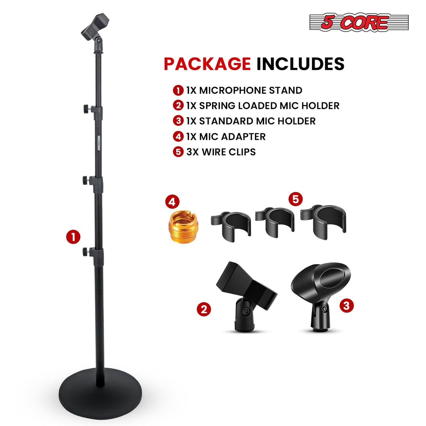 The portable microphone stand floor design allows for easy disassembly and storage. This versatile stand includes 2 adjustable mic clips for precise positioning and a metal screw adapter compatible with most mikes. Benefit from hassle-free height adjustments of our soporte para micrófono and efficient wire management, and a robust build that is perfect for any setting.