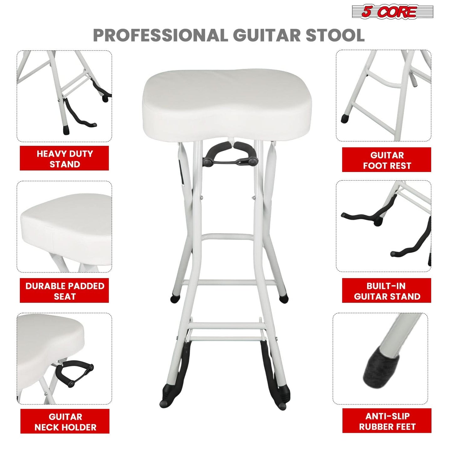 This guitar stool is built with a strong iron frame and a thick 3.15 inch padded seat for steady comfort during long playing sessions. The 29 inch height, 12 inch seat size, and built-in foot rest give you a balanced and natural playing position. A secure guitar neck rest holds acoustic, electric, or bass guitars when you take a break, making it a practical 2-in-1 guitar chair and stand. Non slip caps keep the stool stable on different floors, and the folding design makes storage simple. Ideal for guitarists who want a dependable guitar seat for home, studio, or stage use. |