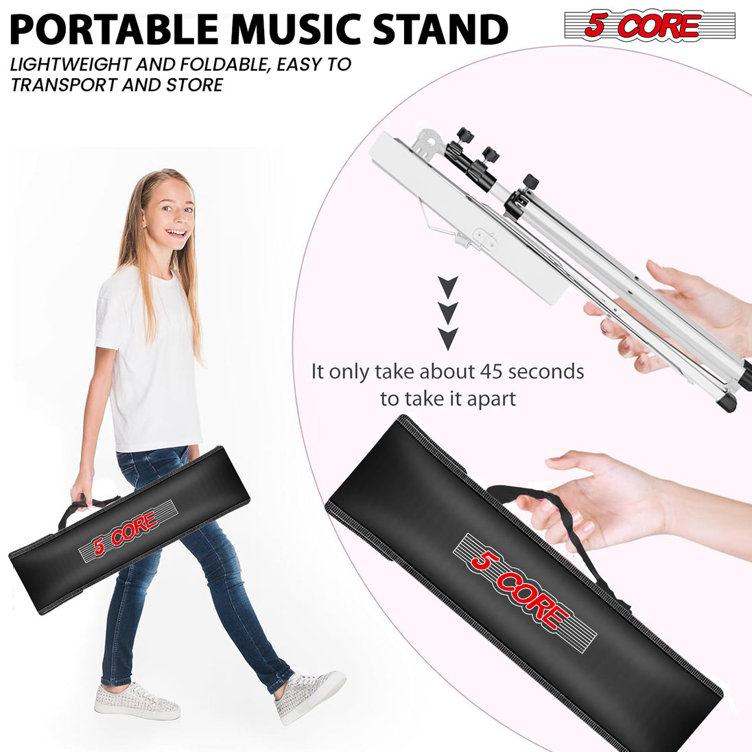 【Portable And Collapsible Design】 This folding music stand portable setup is lightweight and comes with a carrying bag for easy travel. Whether you're heading to practice, a gig, or a classroom, this collapsible music stand folds down quickly and fits neatly into your gear bag—no disassembly needed.