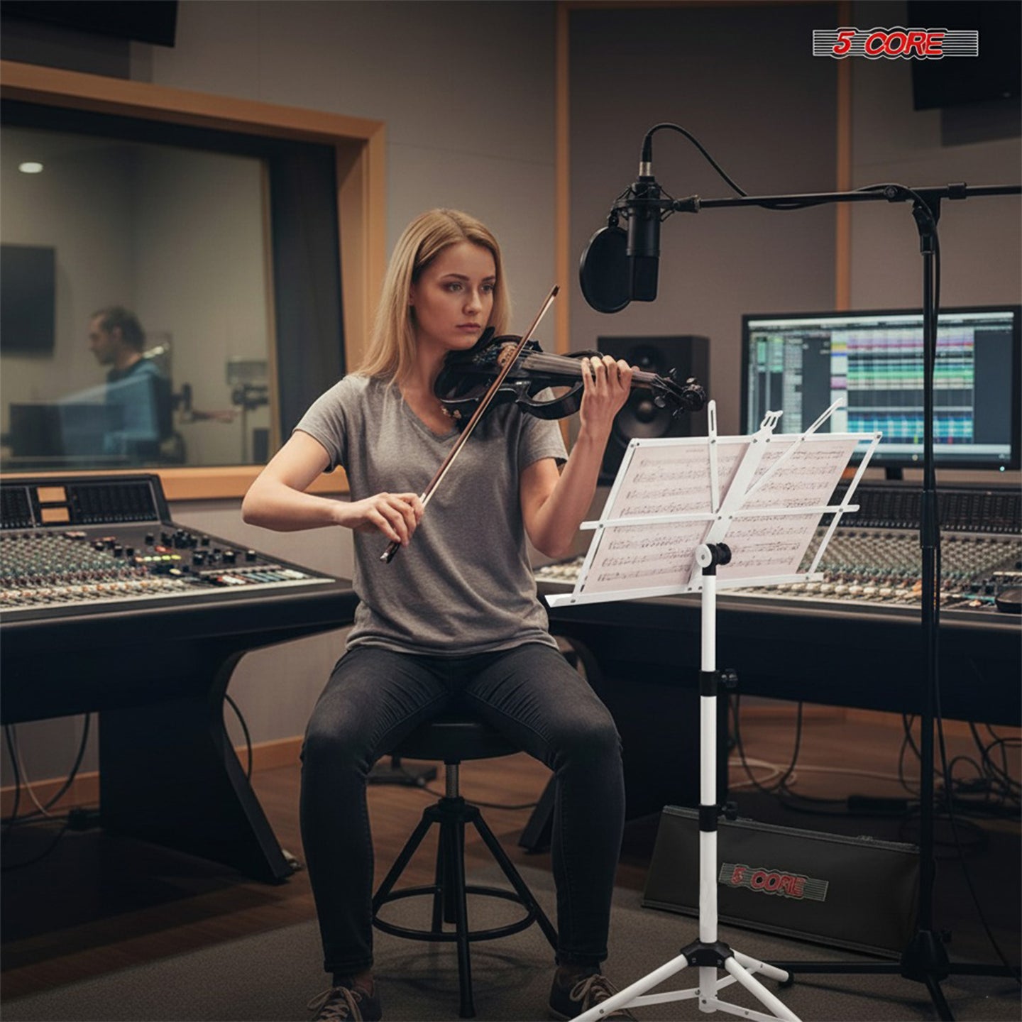 I love how compact this stand folds down. It fits neatly in the carrying bag and is super easy to set up. The tripod legs provide excellent stability, and the non-slip rubber pads protect my floors while keeping the stand steady. It supports heavy music books without any wobbling, making it a reliable choice for any musician traveling between venues.