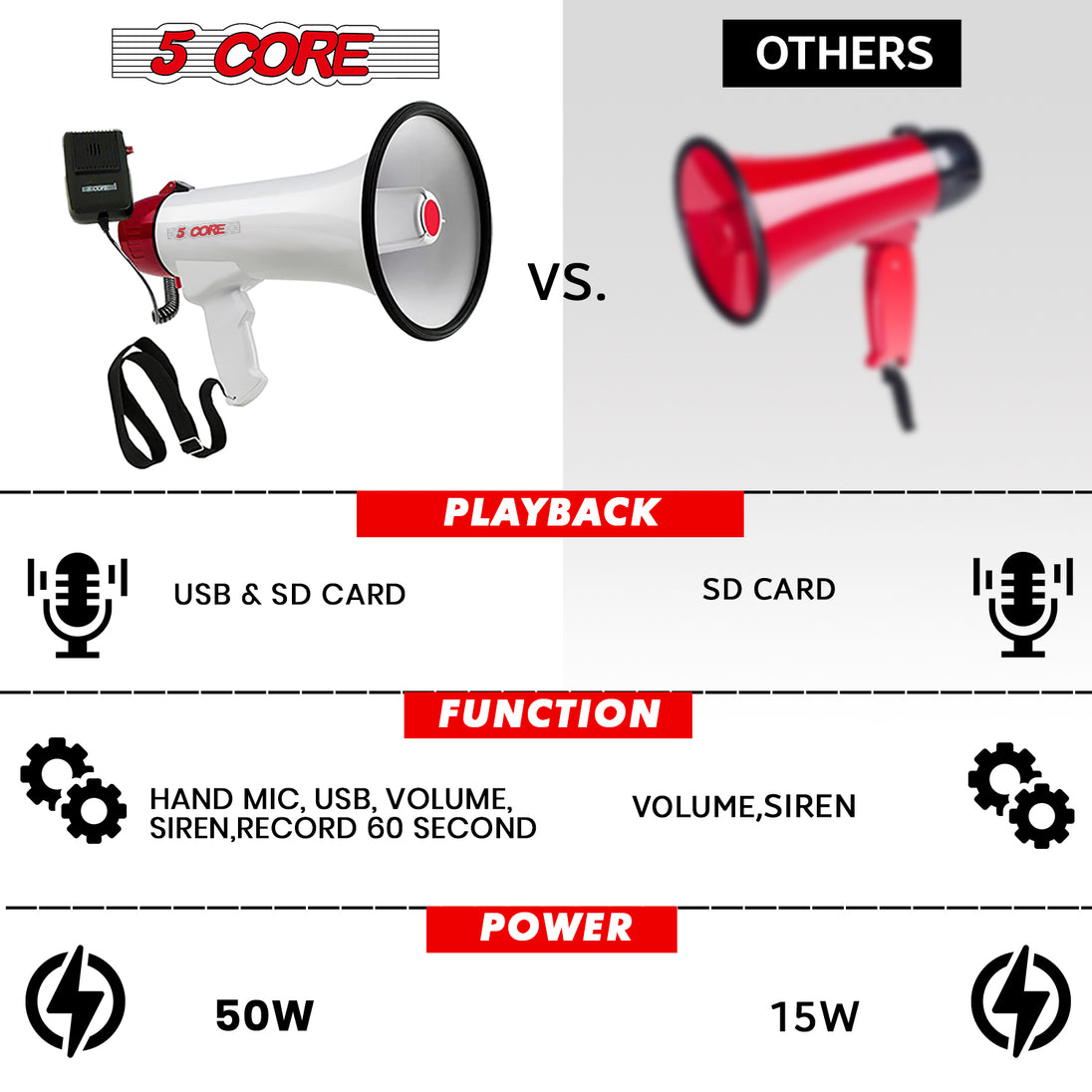 5 Core professional bullhorn megaphone, designed to make your voice heard with clarity and precision! Available in sleek white and red color, it delivers a robust 50W of power, ensuring your message carries across any crowd. Easily adjust the volume on the bull horn loud speaker to suit your needs.