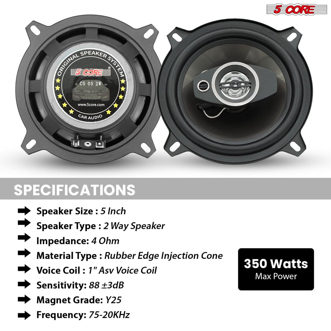 Enhance your driving experience with 5 Inch coaxial speakers 350W max power and 35W RMS, delivering clear, powerful sound with deep bass and crisp highs. These 2 way coaxial car speakers feature an 88 ±3dB sensitivity rating and a wide frequency range of 75-20KHz, ensuring balanced audio clarity. Built with a durable rubber edge injection cone, 1” Copper voice coil, and Y30-grade magnet, these car door speakers provide long-lasting performance. With a compact 58mm mounting depth, they fit seamlessly into cars, trucks, and SUVs, making installation effortless. Upgrade your car stereo system today for an immersive listening experience! |