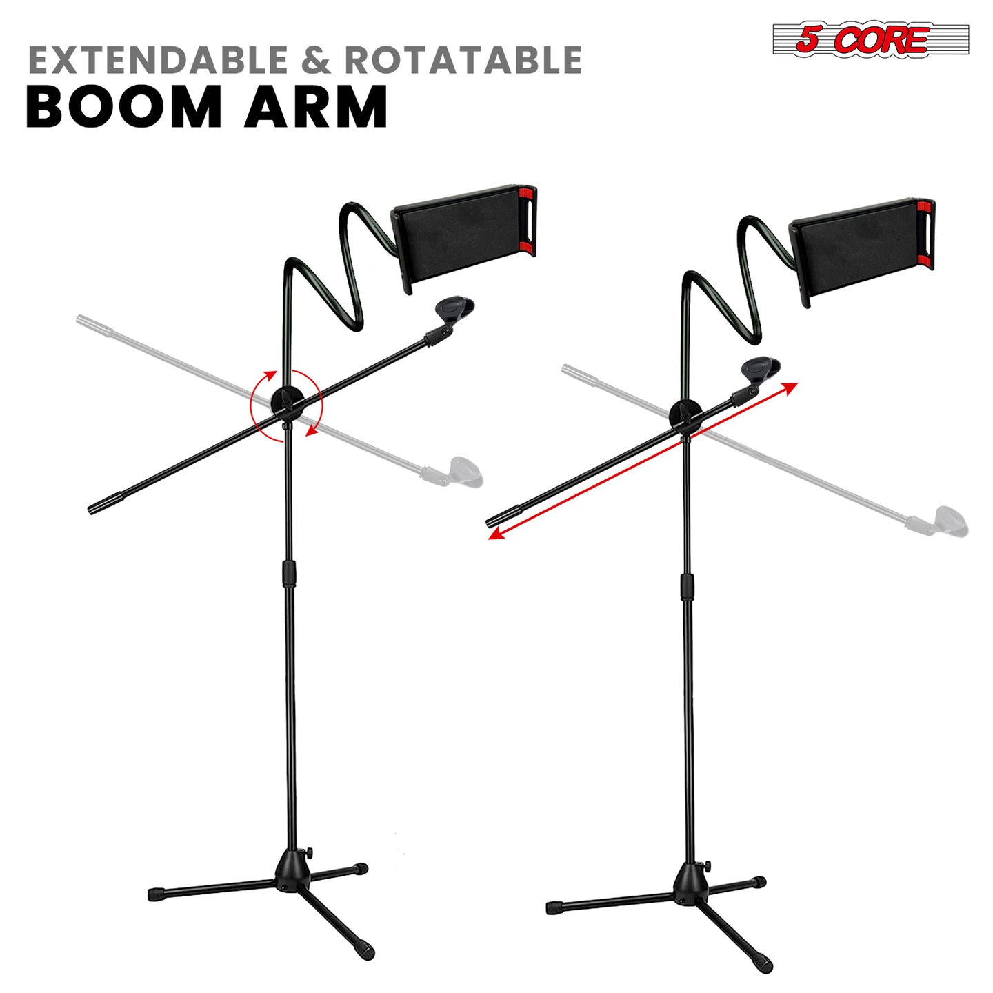 5 Core mic stand with phone and tablet holder, designed for maximum convenience and versatility. The clamp-style phone holder support most smartphones. The tablet holder is adjustable and can accommodate devices up to 6.9 inches. With a height range of 44 to 67 inches, this tripod mic stand floor suits any setup. Made from metal with anti-corrosion paint, it ensures reliable use for long time. Anti-slip rubber caps offer superior stability on any surface, protecting your floors. Enjoy flexible adjustments with a 360-degree gooseneck rotation, extendable boom arm, and adjustable mic holder. The tripod microphone stand has a foldable design and comes with a premium bag, making it easy to portable and store. Whether you're a musician, content creator, or speaker, this boom mic stand provides functionality and practicality for all your needs.